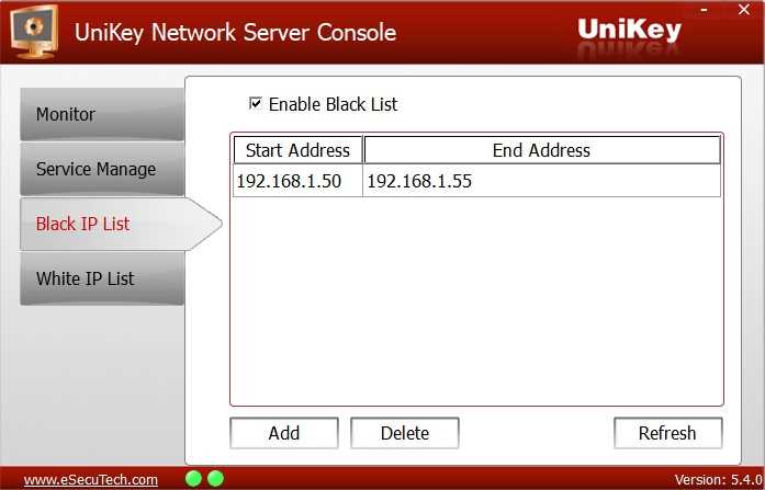 در زبانه Black IP List می توانید یک لیست از IPهایی که نمی خواهید از قفل سخت افزاری استفاده کنند را وارد نمایید. برای فعال کردن این امکان گزینه List Enable Black List را فعال نمایید. برای اضافه کردن IP جدید بر روی دکمه Add کلیک نمایید. در پنجره باز شده در قسمت، Start IP Address I و در قسمت End Ip Adress، محدوده رنج IP مورد نظر را وارد و بر روی دکمه Ok کلیک نمایید. برای حذف یک IP در لیست، IP مورد نظر را انتخاب و گزینه Delete را انتخاب نمایید.