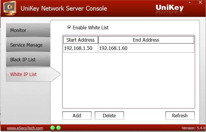در زبانه White IP List می توانید یک لیست از IPهایی که می خواهید از قفل سخت افزاری استفاده کنند را وارد نمایید. برای فعال کردن این امکان گزینه List Enable Whaite List را فعال نمایید. برای اضافه کردن IP جدید بر روی دکمه Add کلیک نموده و در پنجره باز شده در قسمتStart IP Address ، IP  و در قسمت End IP Address  محدوده رنج IP مورد نظر را وارد و بر روی دکمه Ok کلیک نمایید. برای حذف یک IP در لیست، IP مورد نظر را انتخاب و گزینه Delete را انتخاب نمایید.