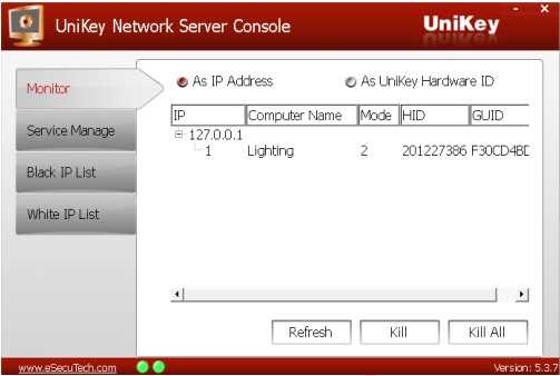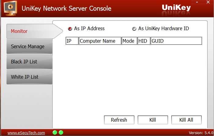 در زبانه Monitor لیست سیستم هایی که از قفل سخت افزاری استفاده می نمایند، نمایش داده می شود.   برای حذف کاربر استفاده کننده، کاربر را در لیست انتخاب و بر روی دکمه Kill کلیک نمایید. برای حذف تمام کاربران استفاده کننده، بر روی دکمه Kill All کلیک نمایید. با استفاده از دکمه Refresh لیست کاربران استفاده کننده از قفل به روز می شود.