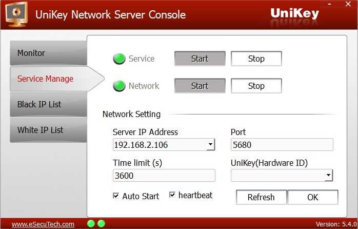 در زبانه"Service Manage "می توانید وضعیت و تنظیمات سرویس قفل سخت افزاری را مشاهده نمایید. در زبانه "Service "می توانید وضعیت سرویس قفل را مشاهده نمایید و در صورتی که چراغ آن سبز باشد، سرویس فعال است. برای غیر فعال کردن سرویس بر روی دکمه Stop کلیک نمایید و در صورتی که چراغ قرمز باشد، سرویس غیر فعال است و هیچ کاربری اجازه استفاده از قفل سخت افزاری را ندارد. برای فعال کردن سرویس بر روی دکمه Start کلیک نمایید. در قسمت "Network "می توانید وضعیت سرویس "Network "قفل را مشاهده نمایید در صورتی که چراغ آن سبز باشد، سرویس فعال است. برای غیر فعال کردن سرویس بر روی دکمه Stop کلیک نمایید. در صورتی که چراغ قرمز باشد، سرویس غیر فعال است و هیچ کاربری در شبکه اجازه استفاده از قفل سخت افزاری را ندارد. برای فعال کردن سرویس بر روی دکمه Start کلیک نمایید.   در قسمت Network Setting می توانید وضعیت تنظیمات شبکه سرویس قفل را مشاهده نمایید.   در قسمت "Server IP Address "آدرس IP کامپیوتر سرور نمایش داده می شود. در قسمت Port، شماره Port استفاده از قفل نمایش داده می شود که در صورت نیاز می تواند شماره Port را تغییر دهید. در قسمت  Time limit می توانید مدت زمانی که کاربر می تواند از قفل استفاده کند را وارد نمایید. به عنوان مثال در صورتی که در این قسمت عدد 30 را وارد نمایید و کاربر در مدت 30 ثانیه از برنامه استفاده نکند ارتباط آن با قفل قطع می شود و در برنامه خطای ارتباط برنامه با قفل سخت افزاری نمایش داده می شود. این عدد به صورت پیش فرض روی 3600 ثانیه است و پیشنهاد می شود از تغییر در آن خودداری نمایید. در قسمت UniKey(Hardware  ID) اطلاعات قفل سخت افزاری نمایش داده می شود. در صورتی که این قسمت خالی باشد بدین معنی است که قفل سخت افزاری به سیستم وصل نیست. در قسمت "Auto Start "می توانید وضعیت اجرا شدن کنسول قفل سخت افزاری پس از روشن شدن سیستم را مشخص نمایید. پس از هر تغییر در اطلاعات ذکر شده دکمه Ok را انتحاب و سرویس قفل را مجددا راه اندازی نمایید. نکته: چنانچه با ساختار سرویس قفل Unikey آشنایی ندارید، توصیه می شود تنظیمات را تغییر ندهید یا در صورت نیاز به تغییر با واحد پشتیبانی شرکت شایگان سیستم تماس حاصل فرمایید.