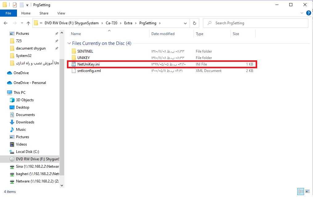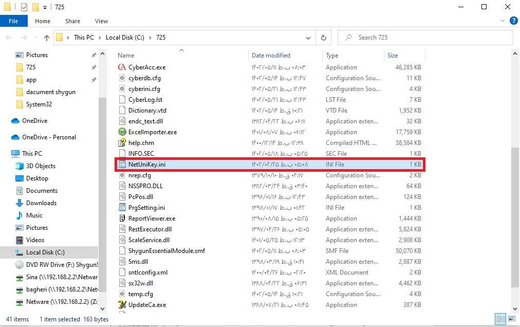 نکته: توجه داشته باشید غیرفعال نمودن Firewall جهت تست شرایط شبکه و موانع ارتباط بین سیستم های شما می باشد، در صورتی که با غیرفعال نمودن Firewall مشکل رفع شد بهتر است با متخصصین امنیت شبکه جهت حفظ امنیت شبکه خود مشورت نمایید.   مرحله سوم: باید از درست انتخاب شدن تنظیمات برنامه حسابگر جهت اتصال به قفل سخت افزاری اطمینان حاصل نمایید. برای بررسی تنظیمات قفل سخت افزاری برروی آیکون برنامه حسابگر برروی صفحه Desktop راست کلیک کرده و گزینه Open File Location را انتخاب نمایید تا محل نصب برنامه برای شما نمایش داده شود. نکته: اگر برروی صفحه desktop، آیکون برنامه قابل مشاهده نبود باید محل نصب برنامه را برروی سیستم پیدا نمایید. پس از مشاهده محل نصب برنامه فایل prgsetting.ini را انتخاب و با برنامه NotePad باز نمایید. پس از باز شدن فایل prgsetting.ini  باید در خط دوم  ProviderName=Unikey باشد و در خط سوم بعد از عبارت Cyberacc ورژن برنامه به درستی نوشته شده باشد. نکته: در خط سوم عدد نوشته شده بعد از عبارت Cyberacc نسخه برنامه شما است. در صورتی که پس از آن عبارت (i) نوشته شده باشد به این معنا است که برنامه شما دارای امکانات برنامه صنعتی است. در غیر این صورت برنامه شما بازرگانی می باشد و بعد از عبارت Cyberacc و ورژن برنامه، عبارت ( 2L ) نشان دهنده دو زبانه بودن برنامه بوده و در غیر این صورت برنامه شما تک زبانه می باشد.   سپس بعد از انجام تمامی مراحل ذکر شده دوباره وارد محل نصب برنامه شده و فایل NetUniKey.ini را با برنامه NotePad باز نمایید. پس از باز کردن فایل NetUniKey.ini در قسمت Server IP  باید IP سیستم Server  نوشته شود.   نکته: اگر فایل NetUnikey.ini  را در محل نصب برنامه وجود نداشت، می توانید فایل مورد نظر را از داخل DVD نصب برنامه وارد پوشه Extraشوید، سپس وارد پوشه Prgsetting شده و فایل NetUniKey.ini را در محل نصب برنامه جایگذاری نمایید.