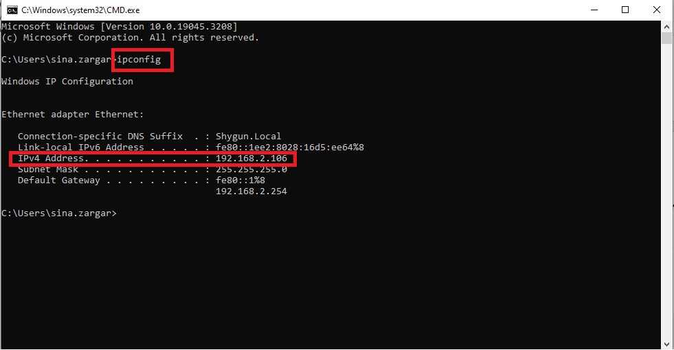 سپس در پنجره باز شده IPCONFIG را تایپ کرده و دکمه Enter را بزنید. IPv4 Address ، IP سیستم سرور می باشد. بعد از انجام تمام مراحل ذکر شده برنامه برروی سیستم کلاینت اجرا می شود.