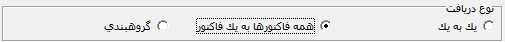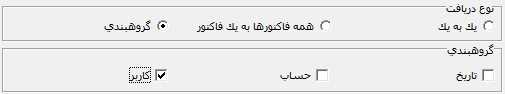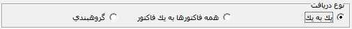3- گروهبندی: در صورتی كه در قسمت نوع دريافت، گزينه "گروهبندی" را فعال کنید، دريافت فاكتورها میتواند بر اساس تاريخ فاكتور، طرف حساب فاكتور يا كاربر صادر كننده فاكتور صورت پذيرد. به عنوان مثال اگر دريافت فاكتورها بر اساس كاربر صادر كننده انجام شود، تمام فاكتورهای سريعی كه توسط یك كاربر خاص صادر شدهاند، به صورت یك فاكتور فروش وارد سيستم میشوند.
