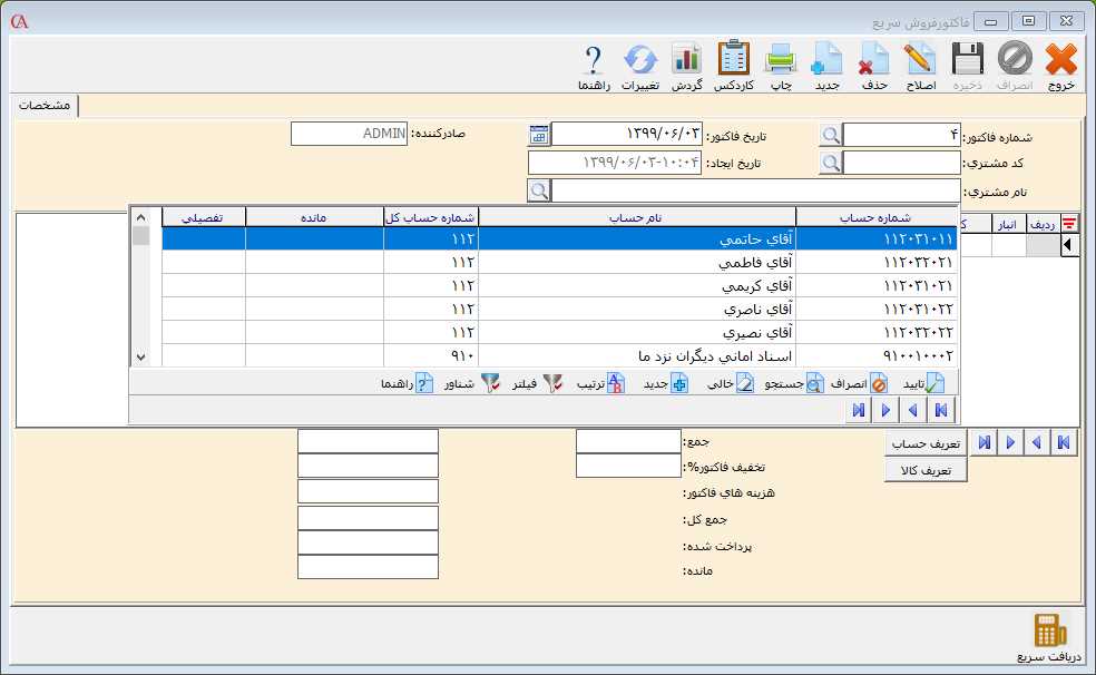 در فرم باز شده سيستم به صورت اتوماتيک يک شماره فاکتور جديد (يک واحد بيشتر از آخرين شماره فاکتور) به فاکتور جديد اختصاص میدهد که جهت صدور فاکتور سریع جديد بر روی دکمه تاييد کليک کنيد. در قسمت کد یا نام مشتری، کد یا نام مشتری را با استفاده از دکمه ذرهبین از لیست حسابها انتخاب کنید.