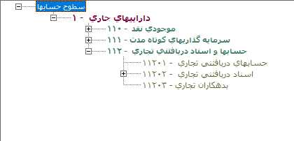به عنوان مثال مجموعهای را در نظر بگیرید که بدهکاران تجاری (مشتریان) آن در استانهای مختلف هستند و میخواهید اطلاعات مربوط به مشتریان را بر اساس استانها دستهبندی نمایید. گروهبندی حسابها در این مجموعه به این صورت است که حساب سرگروه به نام "داراییهای جاری"، حساب کل مربوط به این سرگروه به نام "حسابها و اسناد دریافتنی تجاری" که این حساب دارای دو حساب معین به نامهای "بدهکاران تجاری تهران" و بدهکاران تجاری قم" و هر حساب معین دارای حسابهای تفصیلی به شرح عکس زیر است.
