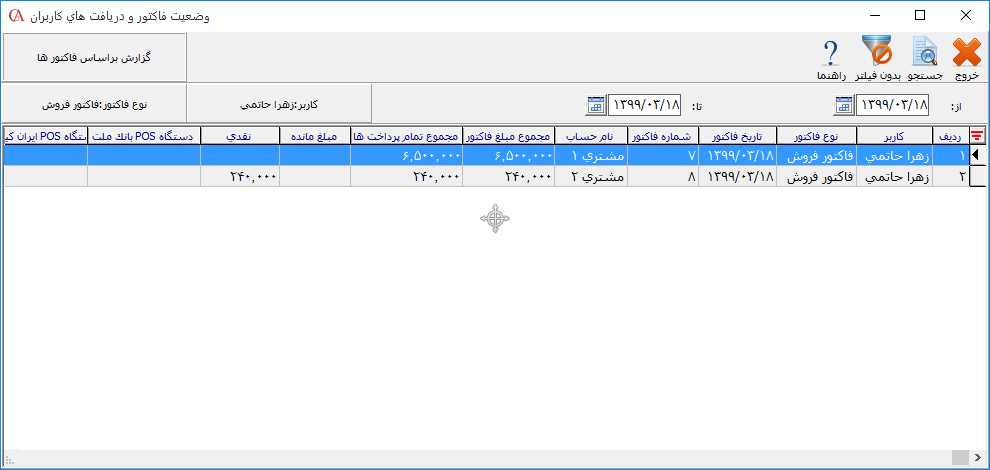 نکته: توجه داشته باشید که تسویه فاکتور فروش سریع نیز به همین ترتیب میباشد. گزارش وضعیت فاکتور و دریافتهای کاربران جهت تهیه گزارشات مربوط به تسویه فاکتورهای ثبت شده از مسیر عملیات روزانه > دریافت سریع > وضعیت فاکتور و دریافتهای کاربران را انتخاب کنید. در فرم باز شده در قسمت محدوده تاریخی، محدوده تاریخی مورد نظر جهت تهیه گزارش را انتخاب کنید سپس بر روی دکمه جستجو کلیک کنید. در جدول این فرم میزان مجموع مبالغ فاکتورها و دریافتیها به تفکیک نوع دریافتهای تعریف شده بر اساس کاربران نمایش داده میشود.