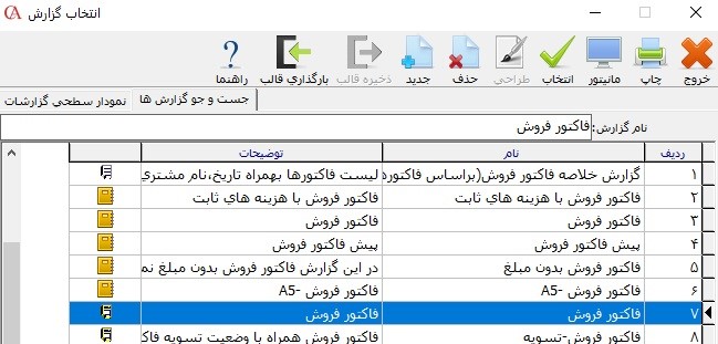 سپس وارد فاکتور شده و گزینه چاپ را زده و در قسمت نوع فرم، گزارش طراحی شده مورد نظر را انتخاب نمایید و از گزارش خود را چاپ بگیرید.