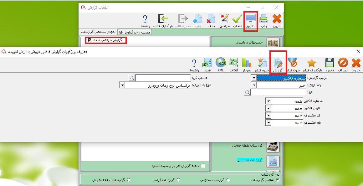 نکته: در صورتی که گزارش شخصی سازی شده در قالب گزارشات فرمی (گزارش فاکتور فروش، برگه دریافت، سند و ...) است و می خواهید در فرم های برنامه از آن استفاده نمایید، ابتدا باید پارامتر های مربوطه را فعال و در فرم مورد نظر پس از زدن دکمه چاپ، قالب مورد نظر را انتخاب نمایید. برای این کار از منوی شرایط محیطی گزینه پارامتر های گزارشات را انتخاب و در فرم باز شده پارامتر مرتبط را فعال نمایید.