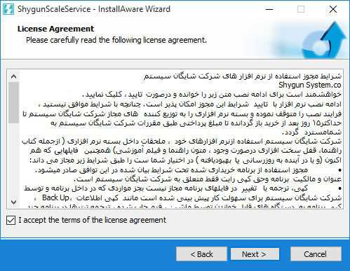 برای نصب مراحل زیر را انجام دهید: در DVD برنامه از مسیر Prog > Scale Service فایل ShygunScale.exe را اجرا کنید. در فرم باز شده چنانچه شرایط مجوز استفاده از نرم‌افزارهای شرکت شایگان سیستم را پذیرفته‌اید گزینه I accept the terms of the license agreement را انتخاب کنید و سپس بر روی دکمه Next کلیک کنید. در مرحله بعد نام و نام شرکت خود را وارد کنید سپس بر روی دکمه Next کلیک کنید. تعیین نام و نام کاربری در مرحله بعد مسیر نصب برنامه را تعیین کنید. بعد از تعیین مسیر نصب بر روی دکمه Next کلیک کنید. تعیین مسیر نصب سرویس متمرکز شایگان سیستم در مرحله بعد بر روی دکمه Next کلیک کنید تا نصب شروع شود. در مرحله آخر بر روی دکمه Finish کلیک کنید. تکمیل نصب سرویس متمرکز شایگان جهت اتصال ارتباط برنامه حسابگر با سرویس متمرکز شایگان از مسیر شرایط محیطی > پارامترهای سرویس متمرکز شایگان را انتخاب کنبد. در فرم باز شده در قسمت آدرس سرویس، آدرس IP کامپیوتری که سرویس متمرکز شایگان (Shygun Scale Service) بر روی آن نصب شده است را وارد کنید. به وسیله دکمه تست اتصال می‌توانید وصل بودن سرویس را کنترل کنید. نکته: در صورتی که از امکان ترازو یا دستگاه کارت‌خوان بانکی (POS) در نرم افزار حسابداری استفاده نمی‌کنید، می‌توانید این سرویس را نصب نکنید.