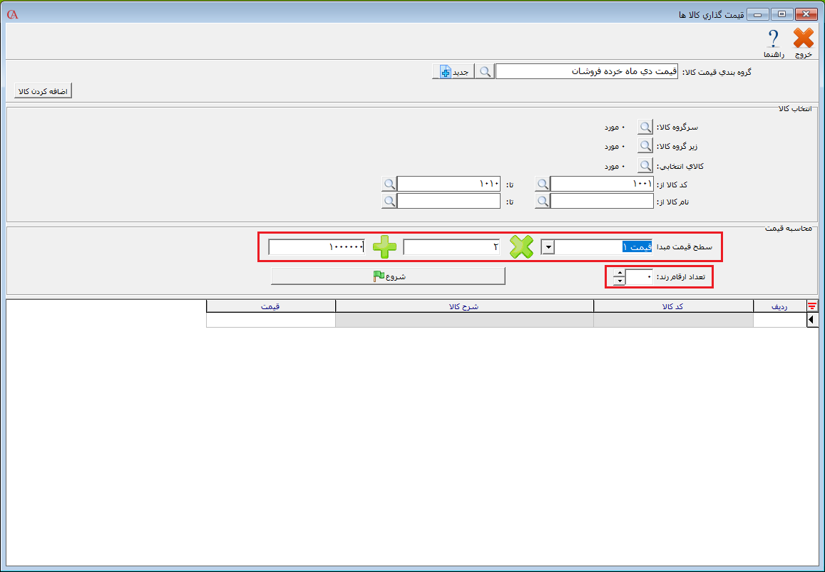 بعد از تعیین موارد بر روی دکمه شروع کلیک کنید. در جدول پایین این فرم، قیمت هر کالا با توجه به محاسبه تعیین شده نمایش داده میشود.
