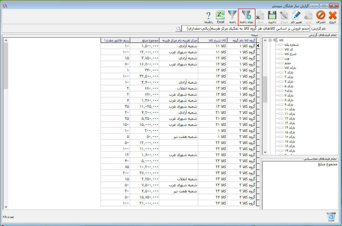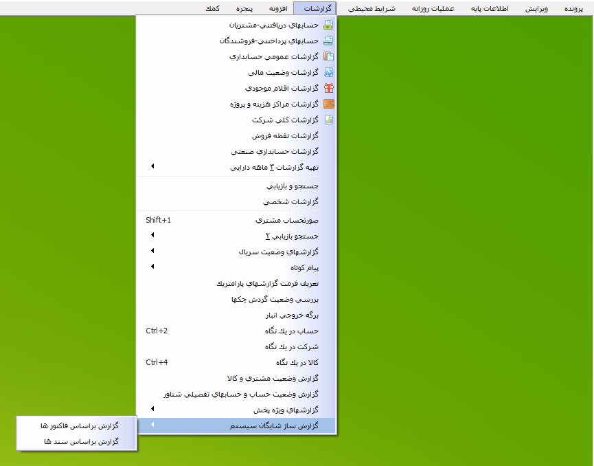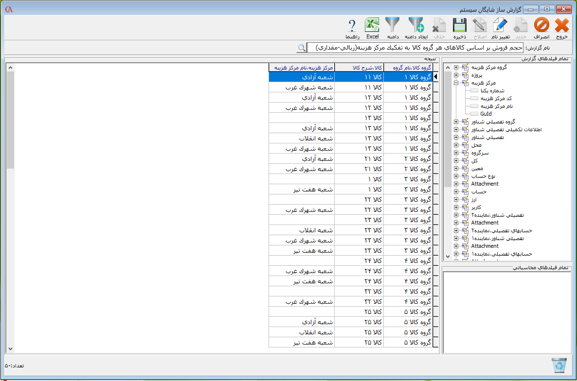 گزارش ساز شرکت شایگان سیستم برخلاف گزارشساز Fast Report و گزارش ساز Quick Report که محدود به استفاده از فیلدهای تعیینشده برای آن گزارش بودید، در اینجا میتوانید به دامنه گستردهای از فیلدها دسترسی داشته باشید. گزارشات این بخش در دو دسته «بر اساس فاکتورها» و «بر اساس سندها» قابل طراحی است که در قسمت بر اساس فاکتور میتوان گزارش را بر اساس اطلاعات فاکتورها و در قسمت بر اساس سندها براساس اطلاعات اسناد ایجاد نمود. برای ایجاد گزارش جدید از منو گزارشات > گزارشساز شایگان سیستم > دسته بندی مورد نظر (گزارش بر اساس فاکتورها یا سندها) را انتخاب کنید. به عنوان مثال چنانچه بخواهید گزارش حجم فروش بر اساس کالاهای هر گروه کالا به تفکیک مرکز هزینه را به صورت ریالی و تعدادی ایجاد کنید، در این بخش گزارش بر اساس فاکتورها را انتخاب کنید. در ادامه این مقاله آموزشی نحوه ایجاد گزارش با استفاده از گزارش ساز شرکت شایگان سیستم توضیح داده میشود.