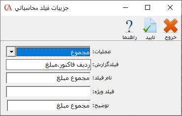 چنانچه در هنگام طراحی نیاز به فیلد محاسباتی باشد در این صورت، فیلد مورد نظر را با عمل کشیدن و رها کردن به قسمت فیلد محاسباتی اضافه کنید. در فرم باز شده در قسمت عملیات، نوع عملیات، در قسمت نام فیلد، نام فیلد و در قسمت توضیح میتوانید توضیحات فیلد را وارد کنید. در قسمت فیلد ویژه میتوانید برای فیلدهای محاسباتی شرط تعیین کنید. به عنوان مثال مجموع مقدار فروشهایی که برای آن تخفیف ردیف در نظر گرفته شده است. برای نوشتن فیلد ويژه با واحد پشتیبانی شرکت شایگان سیستم تماس بگیرید.