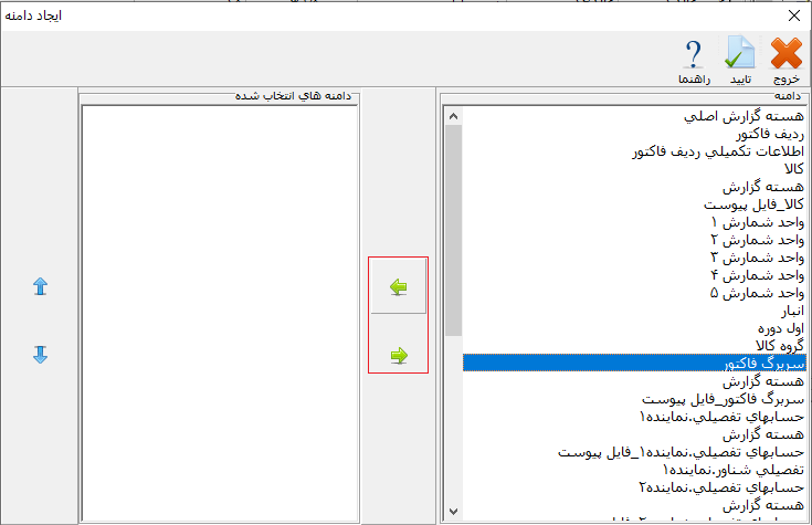 در فرم باز شده در قسمت سمت راست، لیست دامنههای فعال برای گزارش نمایش داده میشود که میتوانید دامنه مورد نظر را انتخاب و با استفاده از دکمههای موجود در این فرم دامنه مورد نظر را به لیست دامنههای انتخاب شده اضافه سپس بر روی دکمه تایید کلیک کنید.