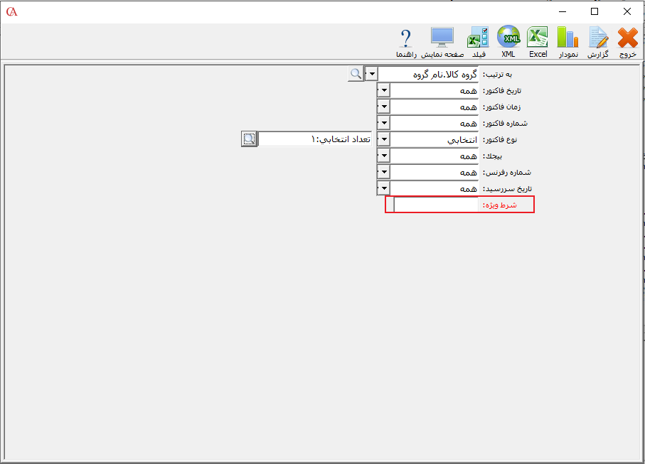 در قسمت شرط ویژه میتوان یک دامنه ویژه در گزارش مشخص کرد که این دامنه به صورت اتوماتیک در گزارش لحاظ میشود. به عنوان مثال در این بخش میتوانید اطلاعات حسابهایی که نوع حساب آن «تراز نقدی» باشد را تعیین کنید. برای نوشتن شرط ويژه با واحد پشتیبانی شرکت شایگان سیستم تماس بگیرید.