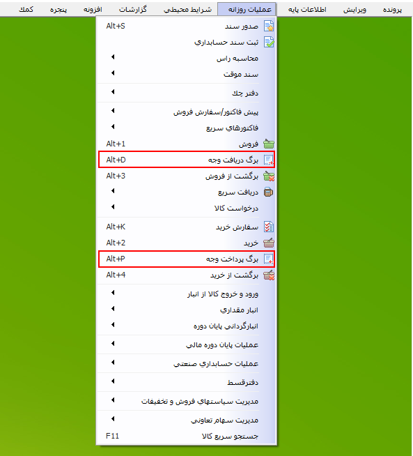 چنانچه بخواهید انواع دریافت وجه را در سیستم تعریف نمایید از منوی اطلاعات پایه > تعریف پیشفرضها اقدام کنید. جهت آشنایی با معرفی انواع دریافت / پرداخت وجه میتوانید به راهنمای آن مراجعه فرمایید.