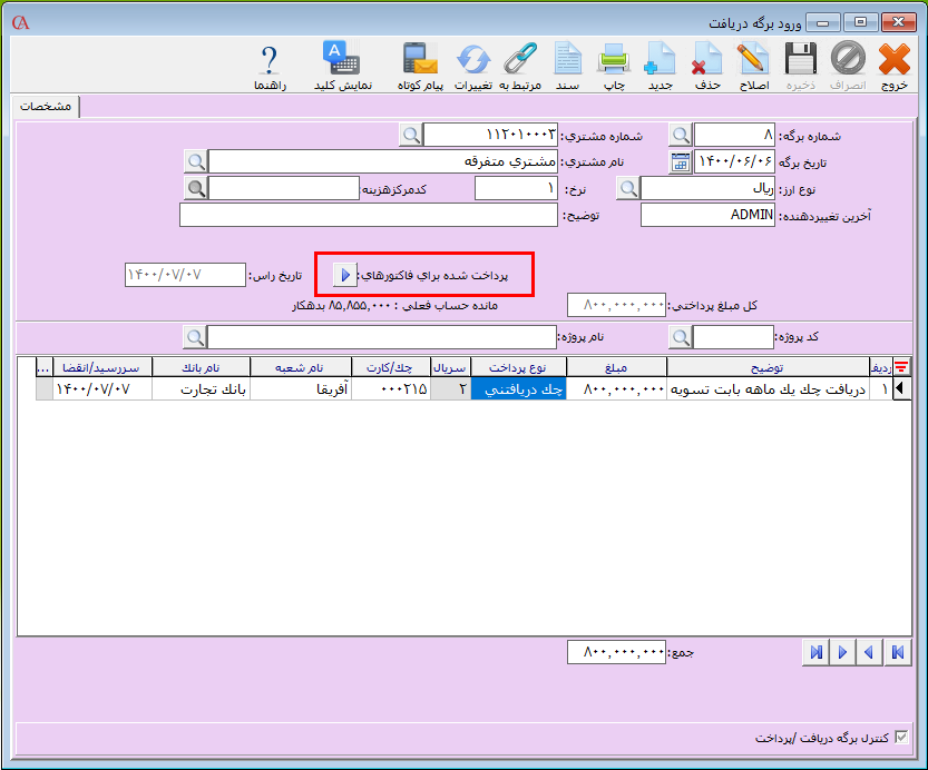 در فرم برگه دریافت / پرداخت وجه میتوانید مبلغ دریافتی / پرداختی را برای تسویه یک یا چند فاکتور به صورت همزمان تعیین نمایید. برای استفاده از این امکان، بعد از تعیین مبلغ مورد نظر و انواع دریافت / پرداخت وجه بر روی دکمه «پرداخت شده برای فاکتورهای» کلیک کنید.