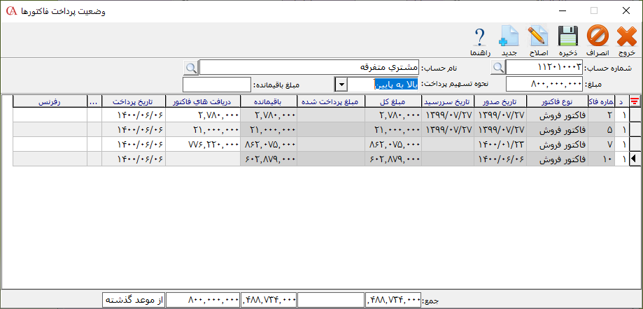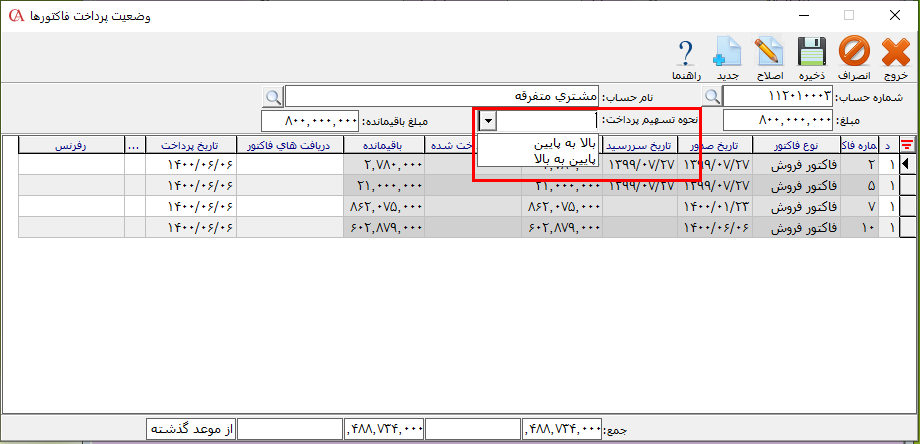 به عنوان مثال در صورتی که حالت بالا به پایین را انتخاب کنید سیستم به صورت اتوماتیک از اولین فاکتور موجود در لیست به سمت پایین بر اساس مبلغ دریافتی، تسویه فاکتورها را اعمال میکند.