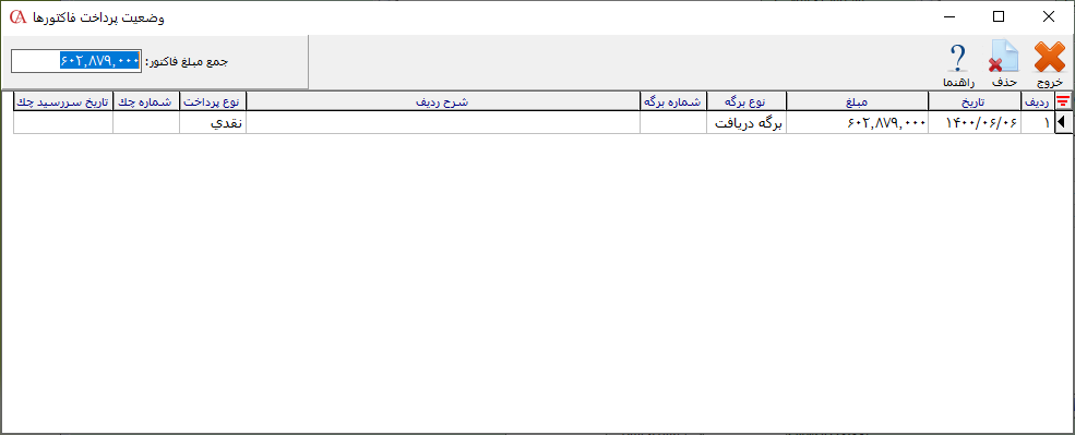 در فرم باز شده لیست پرداختهای مربوط به فاکتور نمایش داده میشود.