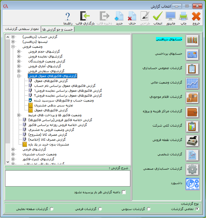 جهت تهیه گزارش اطلاعات مربوط به فاکتورها میتوانید از گزارشات فاکتورهای معوق موجود در نرم افزار حسابداری حسابگر استفاده نمایید. با استفاده از این گزارشها میتوانید مبلغ هر فاکتور به همراه مبلغ پرداخت شده و مانده هر فاکتور را با تاریخ سررسید به تفکیک مشاهده نمایید. برای تهیه این گزارشات از مسیر گزارشات > وضعیت فروش > گزارشهای فاکتورهای معوق فروش > اقدام نمایید.