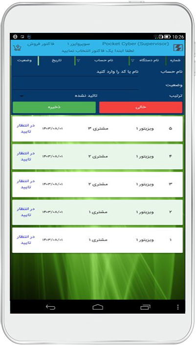- امکان فیلتر فاکتورهای دریافتنی بر اساس نام دستگاه ویزیتور ، نام حساب و وضعیت فاکتور
