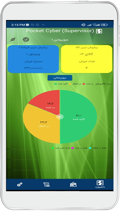 - مشاهده درصد مقدار فاکتورهای رد شده، در انتظار تایید و تایید شده به صورت نمودار دایره ای و میله ای
